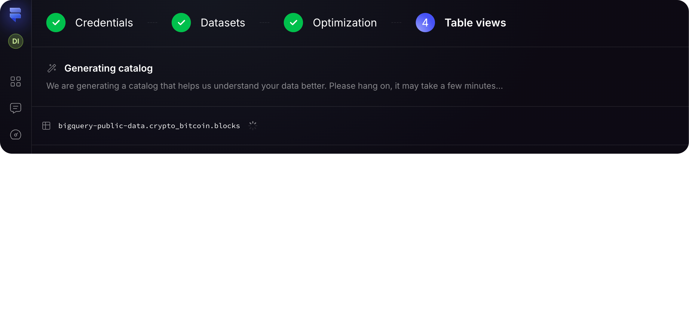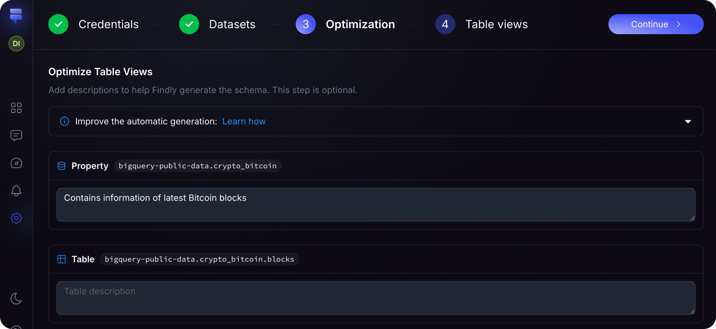 Findly’s automatic setup wizard streamlines the creation of your semantic layer. It guides you through table selection, optimization, and automatic generation, enabling rapid data preparation for analysis.Steps in the Automatic Setup Wizard