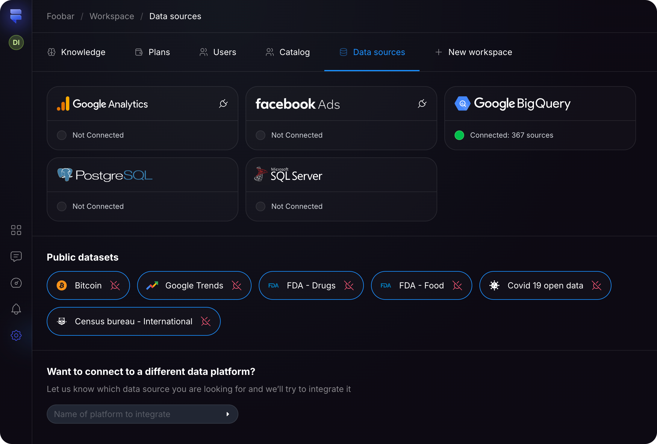 Navigate to the Data Sources page and click the Microsoft SQL Server card.