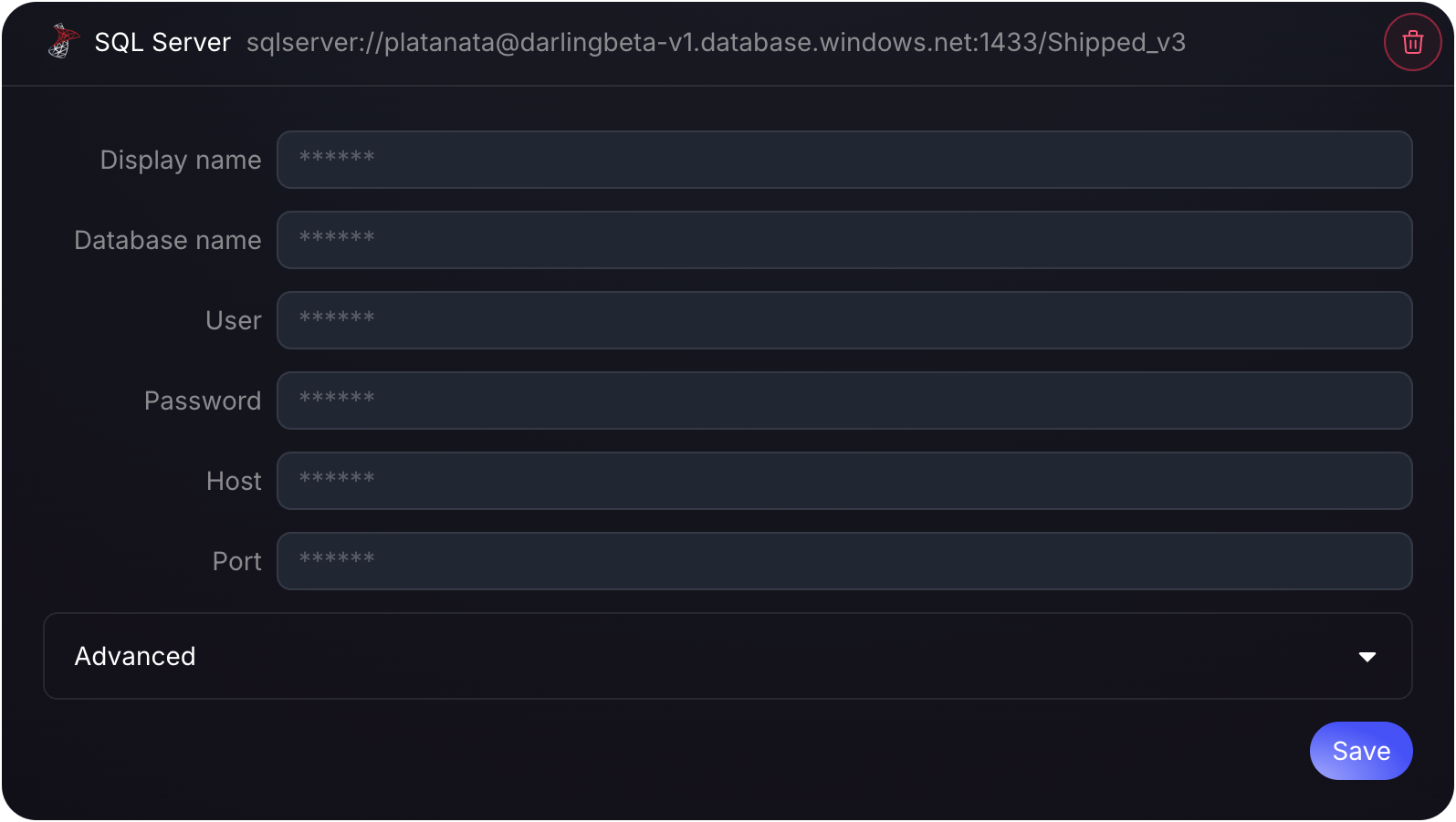 Enter your SQL Server connection details (host name, port, username, password, and database name). Once all fields are completed, click the Connect button.